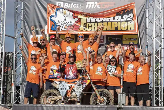« Je suis tellement heureux. Terminer la saison comme ça, c’est vraiment top. Je me sentais bien aujourd’hui même si la piste était un peu dangereuse. Quand je me suis couché dans la deuxième manche, j’ai pensé ‘oh, c’est fini’, mais ensuite j’ai vu que Jago était tombé aussi, alors je me suis relevé aussi vite que possible. On roulait tellement vite. J’ai gagné du temps. C’était vraiment fou, j’ai eu de la chance mais ça fait partie du jeu. C’est ma dernière course en MX2 donc c’était spécial. Je voulais profiter des dernières courses et de l’équipe, qui m’a donné une maison si forte pendant quatre saisons. Avoir le titre pour la deuxième fois est incroyable. Le premier était fou, mais aussi celui-là parce que c’était très serré. Je devais venir ici et faire 1-1 mais ce n’était pas si facile. »