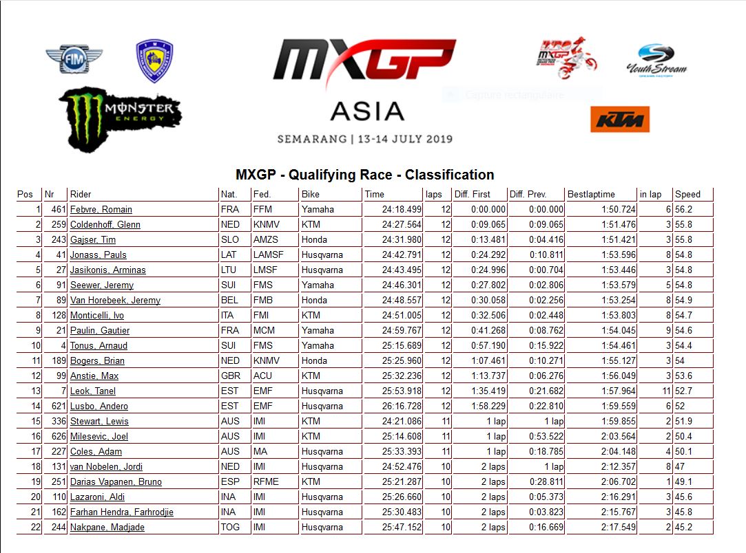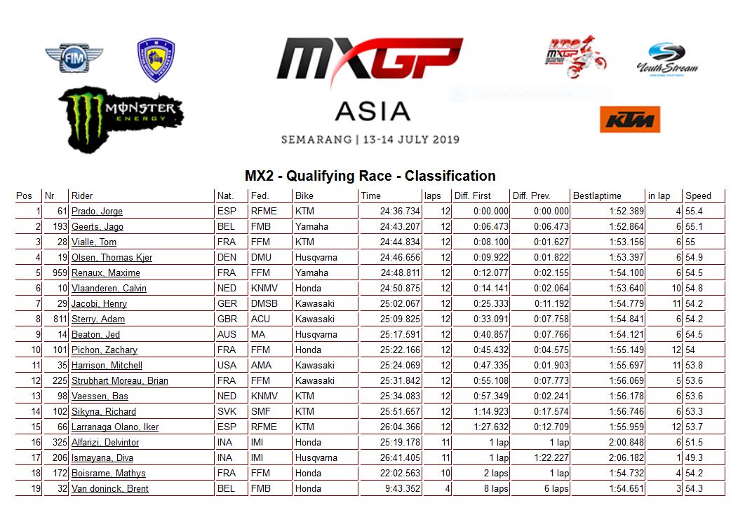 Pas la qualification la plus palpitante de l’année puisque les positions des trois premiers, Prado, Geerts et Vialle n’ont pas évolué pendant les douze tours que comptait la première qualification du week-end. A noter en revanche, la lente descente aux enfers de Mathys Boisramé qui, parti 4e, n’a cessé de rétrograder pour finir en queue de classement pendant que son compatriote, Maxime Renaux ferraillait, lui, pour décrocher une excellente 5e place. Même sentiment mitigé pour le duo Pichon/Strubhart. Si Zach se sentait comme un poisson dans l’eau sur le circuit indonésien et parvenait à arracher la 10e place finale, Brian Moreau, lui, ne parvenait à trouver ses marques et finissait à la 12e place, juste derrière son coéquipier.