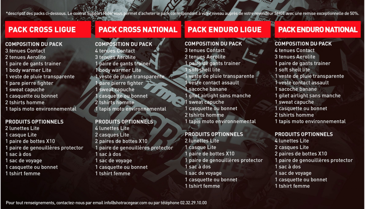 Vous êtes pilote régional, national et cherchez à obtenir un coup de main pour la prochaine saison, Shot pourrait être votre bienfaiteur. La marque offre 25 contrats “Support Rider” aux pilotes qui enverront les 25 plus beaux books. Photos léchées, écrits soignés, présentation artistique de votre plaquette, ne lésinez pas sur les effets pour décrocher des packs bien dotés (cf ci-dessous).