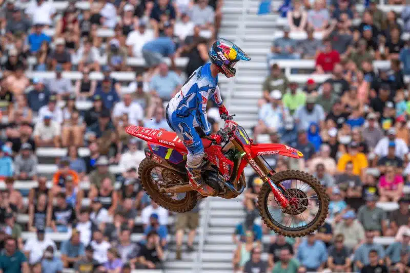 Jett Lawrence remporte donc cette première épreuve, après avoir réalisé le holeshot en recoupant plus promptement que Chase Sexton, sorti un peu large. Sous la pression d’Eli Tomac en début de course, le jeune australien ne s’est jamais retourné et a réussi à garder deux petites secondes d’écart sur le pilote Yamaha, lui même juste devant Chase Sexton. Eli Tomac est ensuite parti seul à la faute dans un virage, laissant le champ libre à Chase Sexton. Mais le pilote KTM n’a jamais pu revenir sur Jett, qui s’impose donc tranquillement devant Sexton et Tomac. Hunter Lawrence prend la quatrième place, après un départ moyen, devant un excellent RJ Hampshire. Suivent Ken Roczen et Cooper Webb, tous les deux un poil décevants, puis Dylan Ferrandis, premier privé. A noter la qualifications de Romain Pape, septième de la « Wild Card race », le nouveau nom du LCQ en Playsoffs. Notre Breton prend la 22e place de la course. Pas de Malcolm Stewart, victime d’une grosse chute au essai.