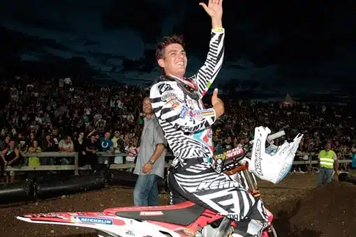 En catégorie SX2, c’est Adrien Lopes qui s’impose au général des deux manches de la soirée. Auteur des deux holeshots, il se classe troisième de la première manche puis remporte la seconde pour s’adjuger la victoire finale. A noter qu’Adrien pilote une Honda CRF relookée façon Jérémy McGrath de l’époque « Peak Pro Circuit ». Juste magnifique !