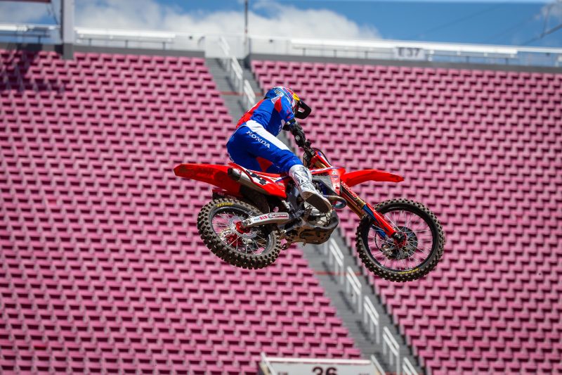 Personne ne savait quoi attendre de cette course, la première des sept disputées à huis clos dans ce stade de Salt Lake City. Première info, la piste. Le promoteur a demandé à l’équipe responsable d’en construire une facile, histoire de replonger tout le monde dans le bain gentiment après la coupure. Effectivement, même sans le « track walk », les pilotes sautaient les enchaînements dès le troisième tour, même les 3/3. Et pourtant, l’altitude n’aide pas en rendant les moteurs anémiques par rapport à une course au niveau de la mer. Le problème, c’est que la course s’est tenue en journée, avec beaucoup de vent et de soleil pour une température de plus de 30°. La recette idéale pour avoir une terre béton et glissante, pile ce qui s’est passé. Evoluer dans un stade vide a fait bizarre aux pilotes, habitués aux cris des fans ou de leurs mécanos qui hurlent dans le casque avant les départs. Adam Cianciarulo a confié à Steve Matthes que du coup, il avait discuté avec Anderson de la vie à Clermont, et qu’il comptait amener une enceinte pour mettre de l’ambiance sur la grille la prochaine fois. Selon Alex Ray, “on aurait entendu une mouche voler” avant la finale. Le monde nouveau !