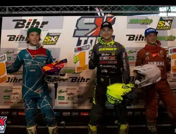 Enfin ! ça y est, Calvin Fonvieille a ouvert son compteur de victoire sur le SX Tour. Et de belle façon puisque l’Albigeois parviendra à revenir d’une 7e place au départ pour coiffer Thomas Do et Pierre Lozzi (ndr, le pauvre Anthony Bourdon, en bagarre pour le leadership, a connu un souci mécanique alors que Julien Roussaly a fini à terre, bras gauche abimé, dès la première boucle ) malgré une piste un poil grassouillette et piégeuse. Une victoire qui lui permet de grimper au provisoire à la troisième place, à égalité avec le quatrième, Pierre Lozzi, mais à seulement deux points de Thomas Do et Julien Rousssaly. Bref, pour le titre, les paris sont ouverts. Signalons sinon, le joli podium de Yannis Irsuti, revenu du fin fond du pack après un mauvais départ et de retour à son meilleur niveau après sa blessure aux cervicales contractées sur le site bourguignon, il y a tout juste un an.