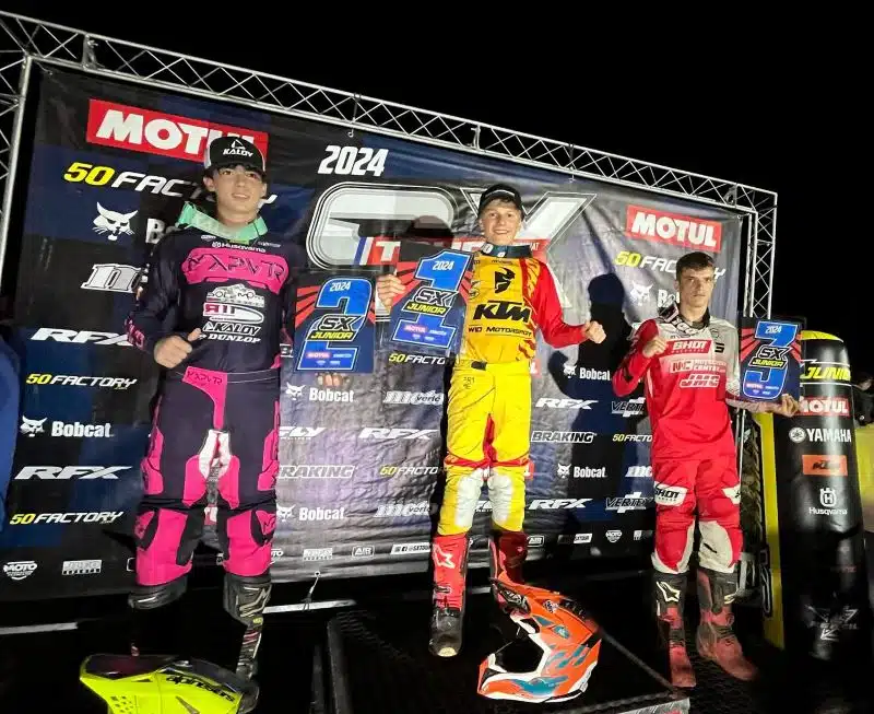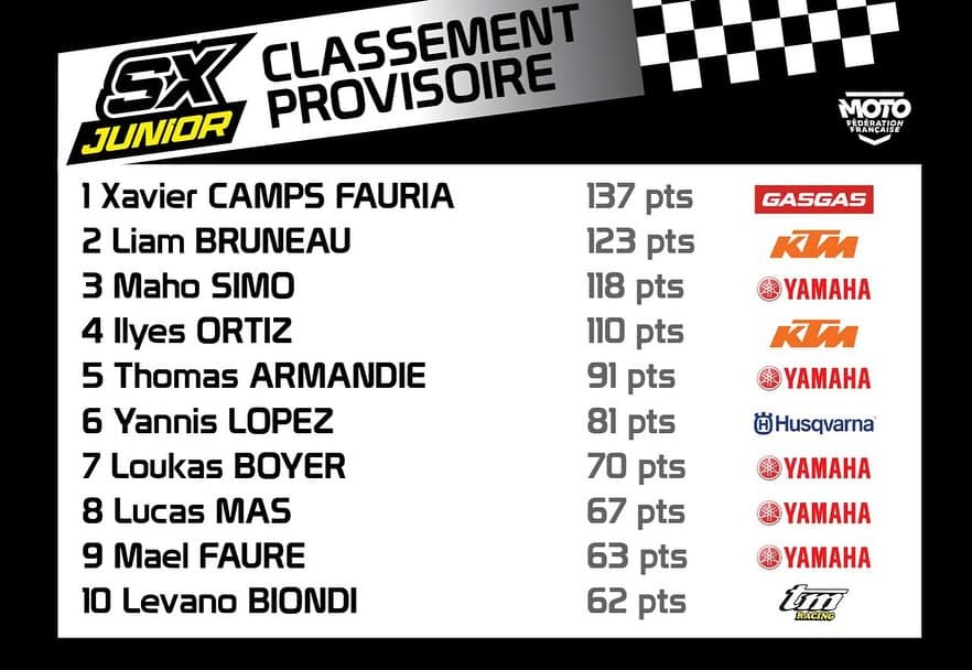C’est donc Liam Bruneau qui l’emporte avec son 3/1, devant Yannis Lopez (1/3) et Xavi Camps (2/4). Maho Simo et Ilyes Ortiz, tous les deux sur le podium à Lizac, complètent le top 5 de cette troisième épreuve du SX Tour Junior. Au championnat, Xavi Camps reste devant avec 137 points, Liam Bruneau récupérant la deuxième place avec quatorze points de retard sur le leader devant Maho Simon, cinq points derrière.