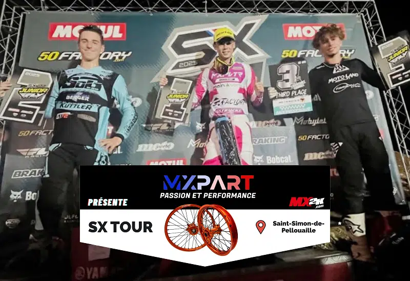 Le SX Tour Junior vous est présenté par MX Part, spécialiste français des roues Motocross, Enduro, Supermotard et Sur-Ron. Personnalisez vous roues jusqu’au bout avec le choix de la couleur des moyeux, rayons, têtes de rayons et cerclage.
