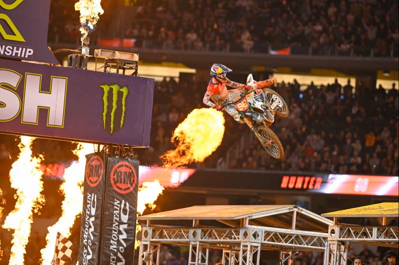 Encore une finale de folie en 450 à Arlington ! Tout a commencé par un holeshot de Cooper Webb, tout de suite passé par son meilleur ennemi Ken Roczen. Hunter Lawrence s’est retrouvé vite troisième, devant un Eli Tomac pourtant mal sorti de la grille mais qui a réalisé des miracles dans le premier tour. Sous pression d’Hunter et en essayant de passer Kenny, Cooper Webb a commis une erreur qui a permis à l’Australien de passer. A partir de là, Hunter Lawrence a cravaché pour trouver l’ouverture sur Roczen, tout en restant sous la menace de Webb, lui-même sous pression de Tomac. Les quatre cadors du champîonnat sont ainsi restés au coude à coude une bonne partie de la finale, jusqu’à ce qu’Hunter trouve l’ouverture et passe en tête. Webb l’a vite suivi en passant Roczen, tout comme Tomac, ce dernier se montrant agressif en allant au contact avec Webb pour le gain de la deuxième place. De quoi permettre à Kenny de repasser !