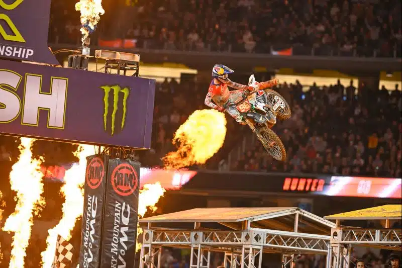 Quelle soirée à Arlington, avec une finale 450 qui a tenu ses promesses ! Hunter Lawrence a été enfin décroché cette première victoire dans la catégorie reine, après une bagarre dantesque avec Eli Tomac, Cooper Webb et Ken Roczen. En 250, l’ouverture de la côte est a été remportée par Pierce Brown, dans des circonstances un peu troubles puisque Jo Shimoda a été contraint d’enrouler un double à cause d’un flash de sécurité sur la piste ignoré par Pierce. Dax Bennick monte sur le podium.