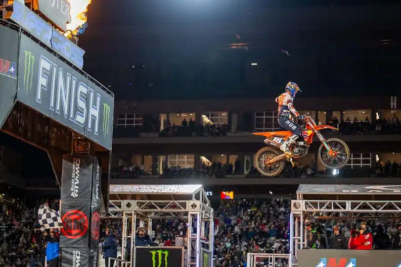 Après leurs victoires au Supercross de Daytona la semaine dernière, ce sont les deux mêmes pilotes qu’on retrouve sur la première marche du podium à Birmingham, à savoir Jett Lawrence en 450 et Tom Vialle en 250.