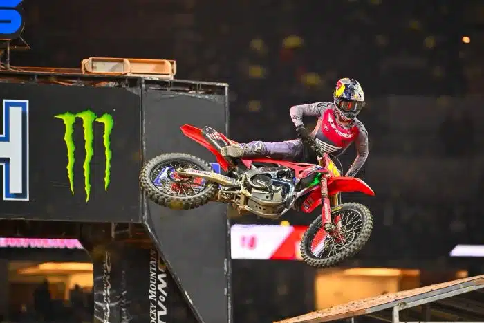 Ken Roczen, vainqueur l’an dernier dans ce même Lucas Oil Stadium d’Indianapolis, s’est offert le premier holeshot de la soirée 450, devant un Jett Lawrence qui s’est tout de suite débarrassé de Jason Anderson, puis a mis quelques tours à mettre dans le rythme, avant d’appliquer une grosse pression à Kenny et le passer. A partir de là, Jett, très rapide dans les whoops, s’est appliqué à ne pas commettre de fautes et remporte la course devant Kenny et Chase Sexton, pas très parti mais bien revenu. Cooper Webb, très rapide, se battait pour le podium quand il a chuté à cause de Cade Clason qui prenait un tour.