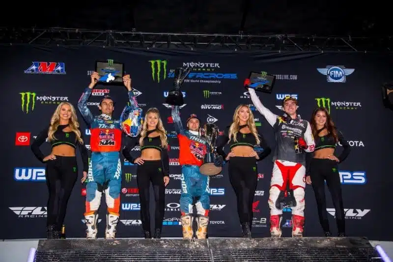 Cooper Webb n’est pas prêt à lâcher le morceau. Son coéquipier Marvin Musquin peut le confirmer, lui qui s’est fait proprement sortir par l’Américain lors de la première manche, alors qu’il chassait Ken Roczen en tête (Ken qui remportera finalement sa première finale de l’année). Webb y croit et il donnera tout quitte à jouer des coudes. Second de la première manche, il remporte la seconde avant de devoir s’incliner face à Musquin et Tomac dans la dernière, non sans s’être bien battu là encore, mais avec le pilote Kawa. Il décroche au final une sixième victoire (2/1/3) qui lui permet de prendre un poil d’avance au championnat car le voilà désormais avec 17 pions d’avance sur Musquin (5/3/1). Maintenant, on se doute que cette dernère a plombé l’ambiance sous le auvent orange. Car encore une fois, il n’a pas pris de pincette avec le Français, le plus rapide en piste, mais qui gâchera sa soirée avec deux chutes dans les deux premières courses. Grosse désillusion aussi pour Roczen qui chutera au seconde départ et se retirera avant de signer une anonyme 8e place lors de la troisième manche, et pour Tomac qui a cumulé les départs moyens avec des courses ternes (6/7/2). De quoi laisser Webb et Musquin s’expliquer en tête à tête pour l’issue du championnat quoiqu’on a vu un excellent Dean Wilson, troisième à Houston (3/3/5), s’immiscer dans le duel KTM dans chacune des manches.