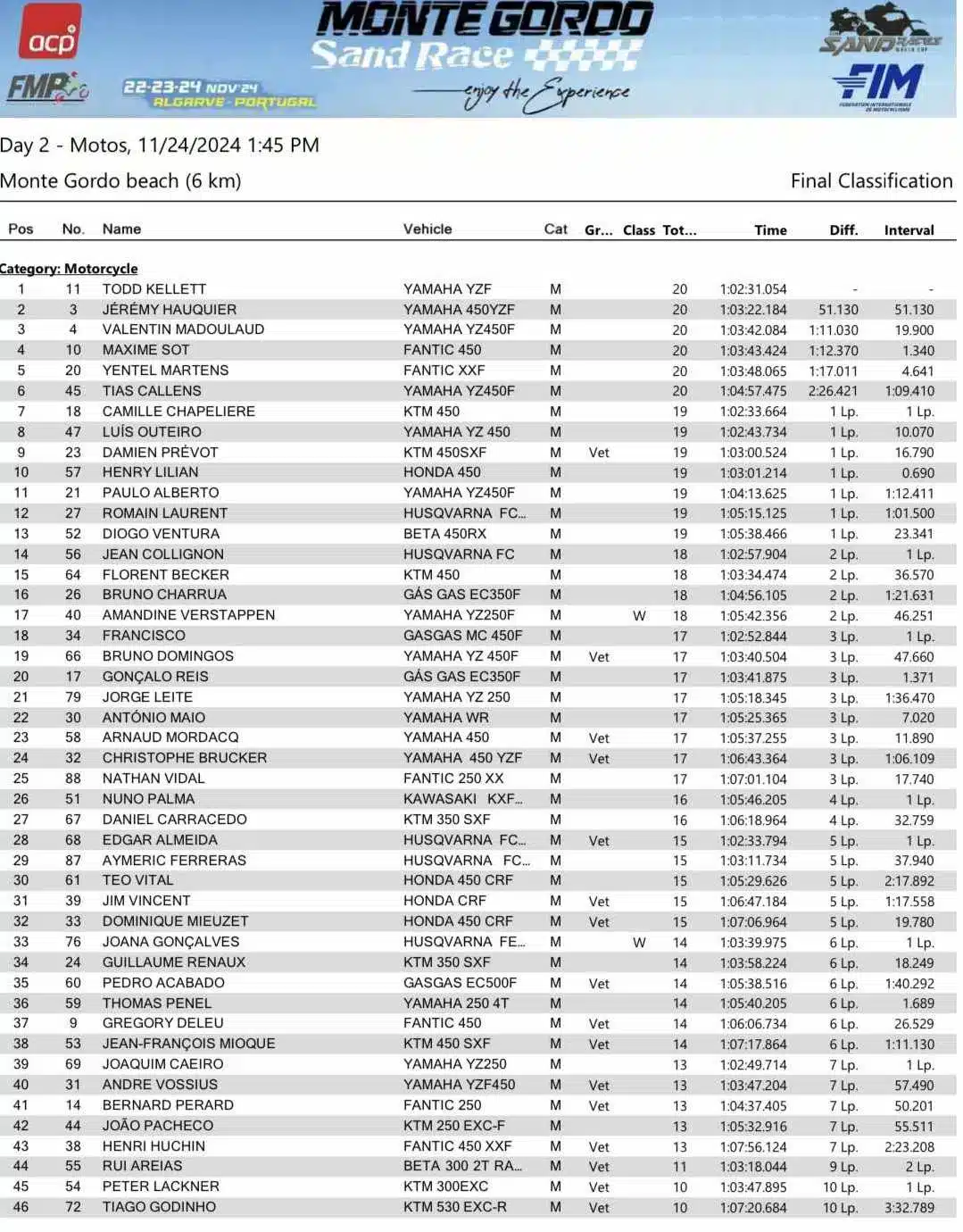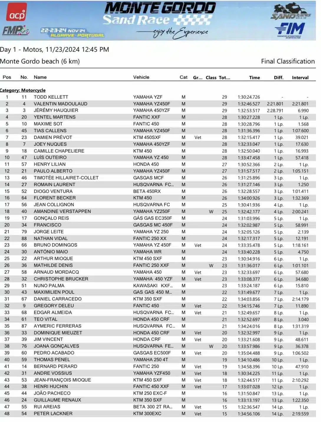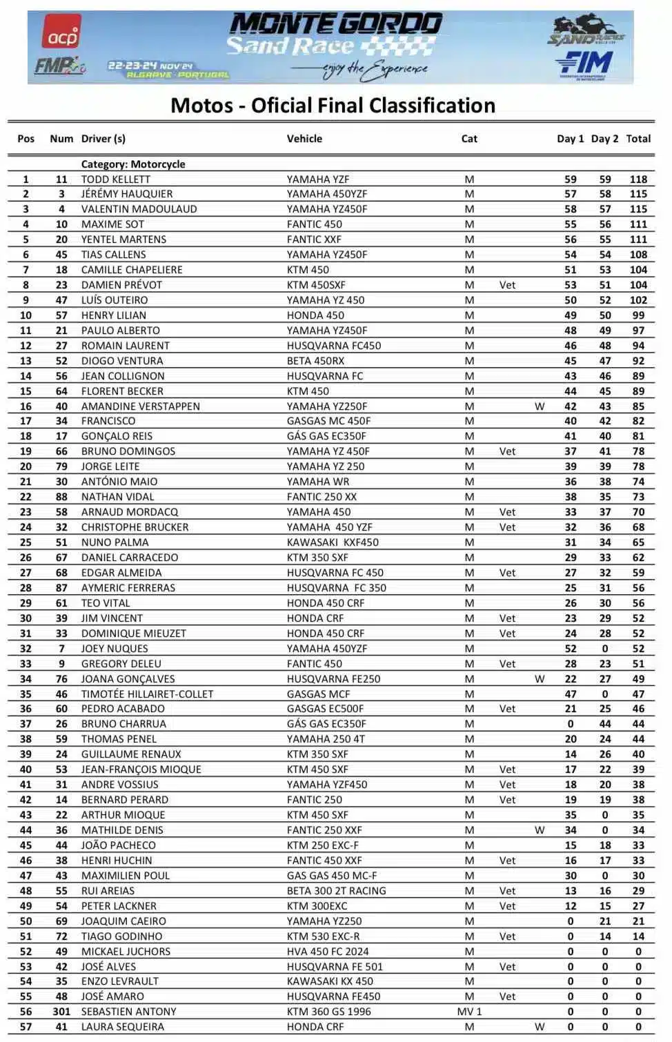 Chez les femmes, Amandine Verstappen continue d’écrire l’histoire. Après avoir déjà scellé son titre lors de la manche précédente en Italie, la pilote belge a une nouvelle fois brillé à Monte Gordo, confirmant son invincibilité en 2024. Ses performances incluent des victoires à l’Enduropale du Touquet Pas-de-Calais, l’Enduro del Verano, la Ronde des Sables de Loon-Plage et la Bibione Sand Storm. Dimanche, Verstappen est remontée de la vingt-neuvième à la dix-neuvième place, totalisant dix-huit tours.