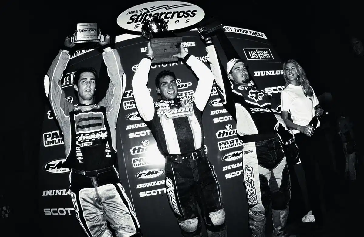 Samedi 10 janvier 1998. El Niño est de passage à Los Angeles. Le phénomène climatique aux effets désastreux est venu plomber l’ambiance sur la manche d’ouverture de la saison de Supercross au Memorial Coliseum. Le matin même, c’est sous une pluie incessante que les écuries américaines ont commencé à investir la zone aménagée en paddock le long du vieux stade californien, site glorieux des Jeux Olympiques de 1932 et 1984. Sur le coup de midi, la situation météorologique s’est encore dégradée : d’inquiétants nuages noirs gonflés d’eau grondante ont transformé le relief mouvementé de la piste en quelque chose qui s’apparente à du chocolat fondu. Le paddock a été informé que les essais libres sont reportés en raison des conditions. Pour l’heure, encore fringués en civil, les pilotes traînent aux abords proprets et bien éclairés de leur hospitality en attendant un prochain communiqué.