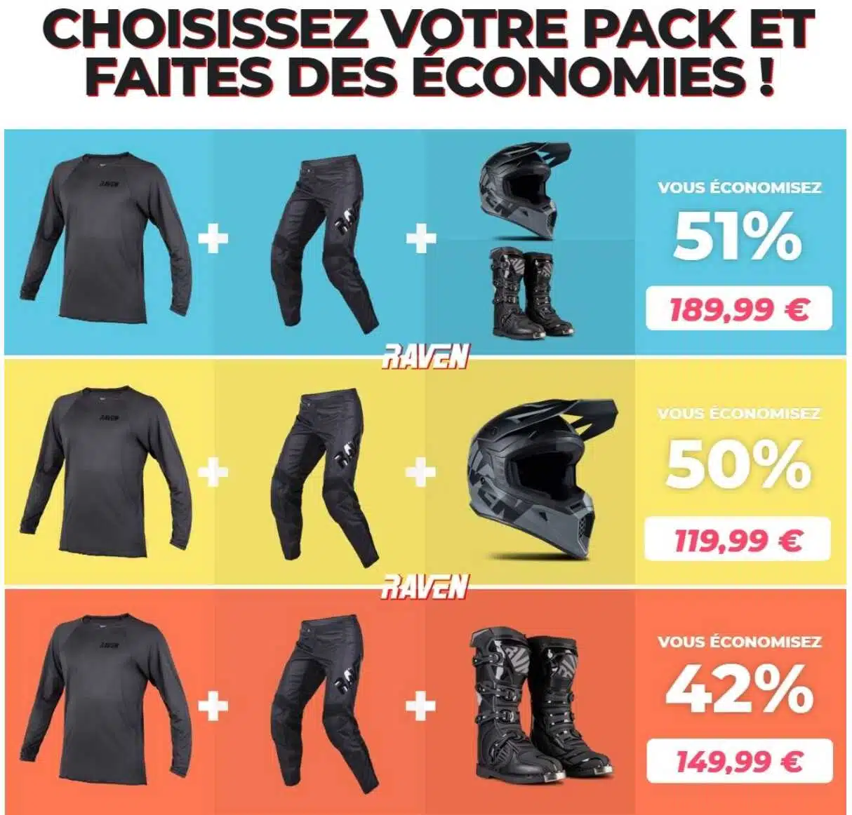 Le premier kit contient la totale ! Une tenue complète de la tête au pied. Pour 189,99 euros, cette offre promotionnelle fournit un maillot Raven avec le pantalon accordé. En plus de ça, un casque et des bottes sont aussi inclus. Avec un total de 189,99 euros, en achetant ce kit, vous ferez 51% d’économie par rapport au prix que vous payeriez en achetant chacun des produits séparément.