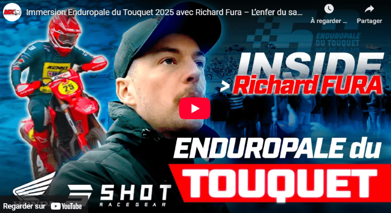 Plongez au cœur de l’Enduropale du Touquet 2025 aux côtés du pilote pro Richard Fura ! Entre préparation intense, départ survolté et lutte dans le sable, vivez l’épreuve mythique comme si vous étiez un membre du team RF250 à part entière, de l’avant-course et sa préparation à l’arrivée. Sensations fortes garanties pendant une trentaine de minutes, pour se donner une vraie idée de ce que c’est vraiment que de rouler à l’Enduropale du Touquet pour un pilote de ce calibre !