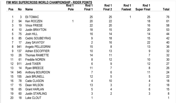 Clairement le deuxième homme, Ken Roczen monte sur la deuxième marche en ayant montré de belles choses. Il devance Vince Friese, évidemment à l’aise quand il s’agit de partir bien et de garder sa place sur des courses courtes. Le vétéran Justin Brayton et Josh Hill complètent le top 5 devant Cédric Soubeyras, premier français. Notez que Joey Savatgy, tombé fort en première manche, était sans doute le troisème pilote en vitesse pure. Le tracé de Cardiff a laissé des traces chez quelques pilotes, notamment Chad Reed, blessé à l’épaule et côtes cassées, ou encore à Josh Grant, Justin Starling et Dean Wilson.